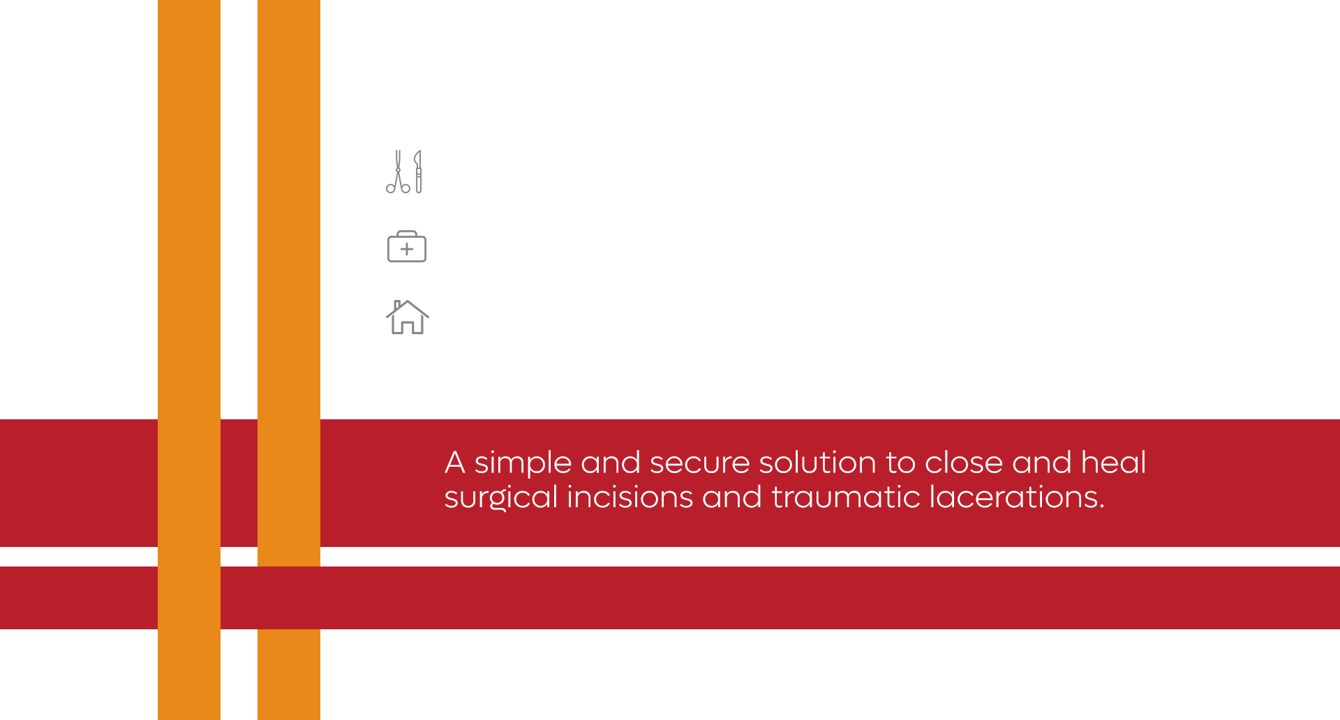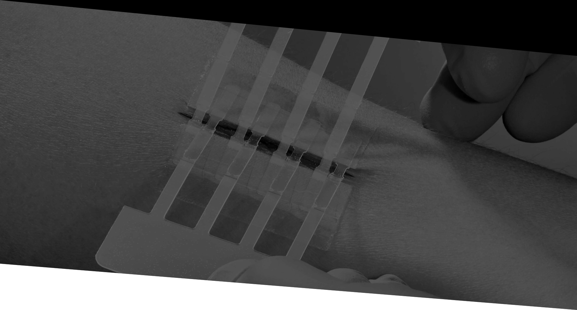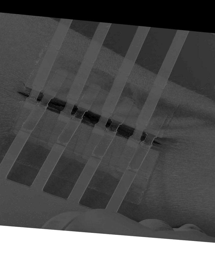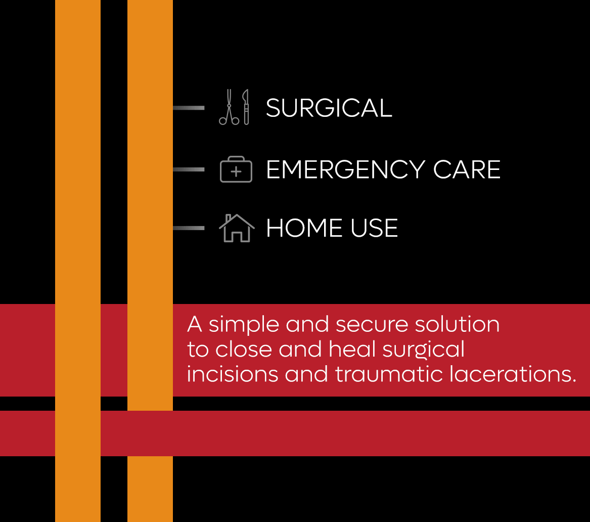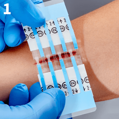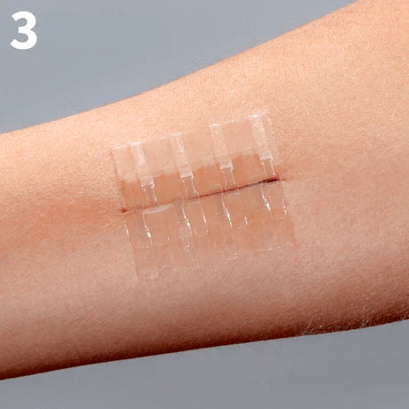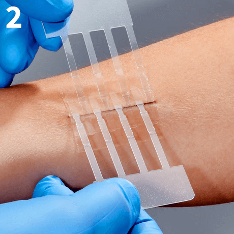 APPLY BOTH PADS TO DRY SKIN ONLY. Holding the LINERS 2 (white), apply each clear adhesive pad to the skin approximately 1/16 inch (1-2mm) back from each side of the wound edge. Gently press to secure each half one at a time